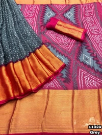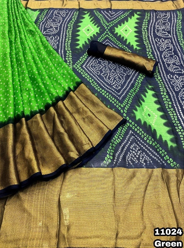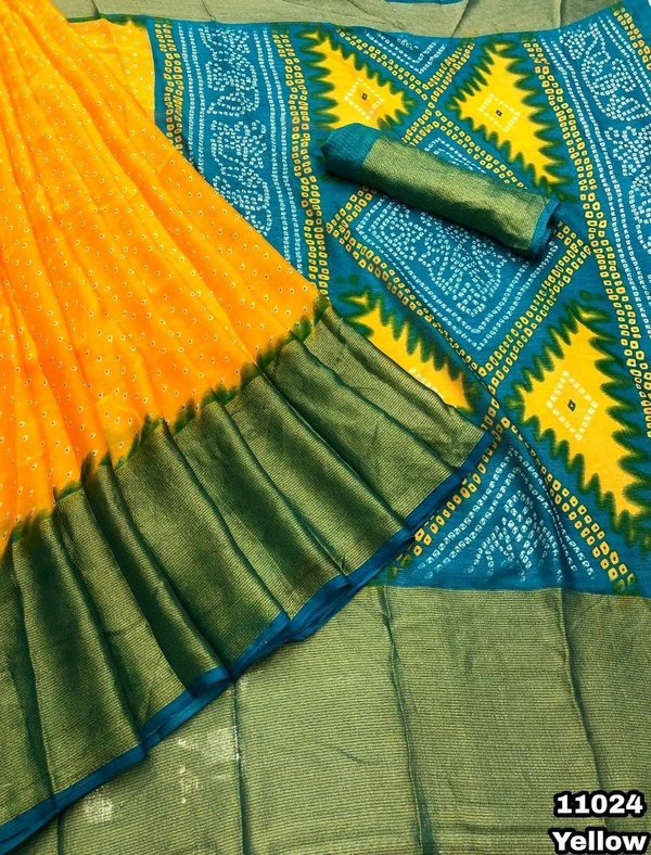 New arrivals Price - 800 Free shipping Design no - 11024 Catalog - Uttara Fabric details - Chiffon bandani print with zari lining border comes with bandani printed palluBlouse - Contrast printed blouseCut Weight - 490 GramPremium quality 😍Book your orders 🔚 We Take Gurantee Of Quality 🔚